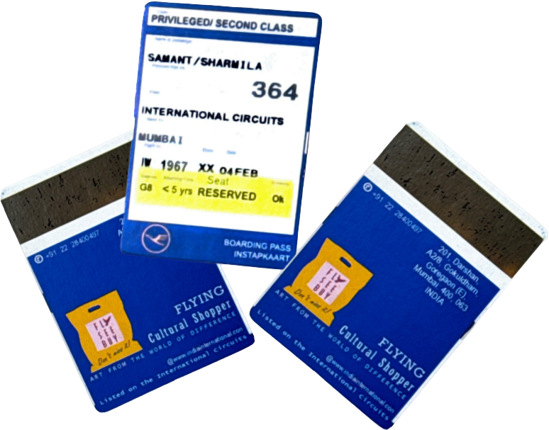 The format references Lufthansa, the airline unofficially associated with deporting immigrants from Western Europe, thus underscoring the tension between freedom of travel and enforced displacement. When arranged collectively, the cards can form objects tied to international travel – such as passports, luggage, or airplanes – or recall historically significant travel icons in the Indian context, including the Gateway of India and India Gate.