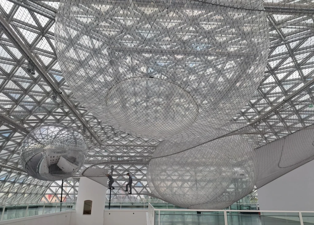 As I step onto the installation, the entire spider-web-like net covering the whole ceiling of the museum gravitates toward my feet. Looking through the exhibitions and audience from the above, my fears immediately spread like a vibration of the net at 25-meters-high. I am inside in orbit (2013), Tomás Saraceno’s installation in Kunstsammlung Nordrhein-Westfalen (K21), Düsseldorf, Germany. Imagine yourself in orbit.